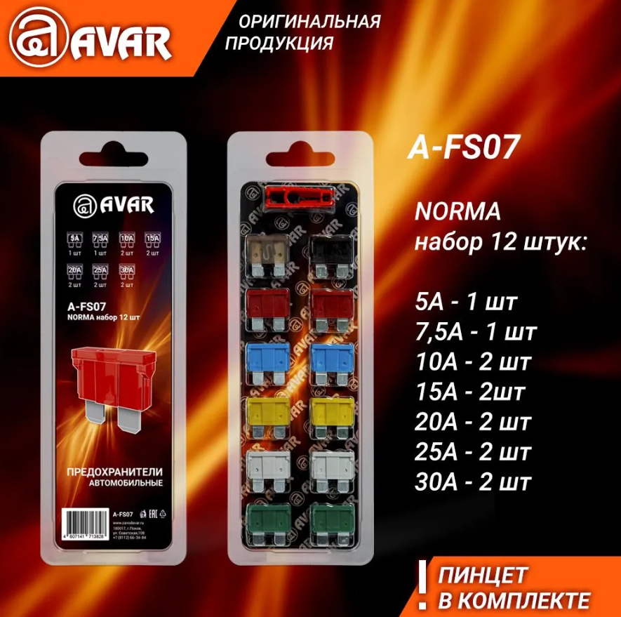 Набор предохранителей NORMA, блистер, 12шт+пинцет (5A,7.5А,2х10А,2х15А,2х20А,2х25А,2х30А)