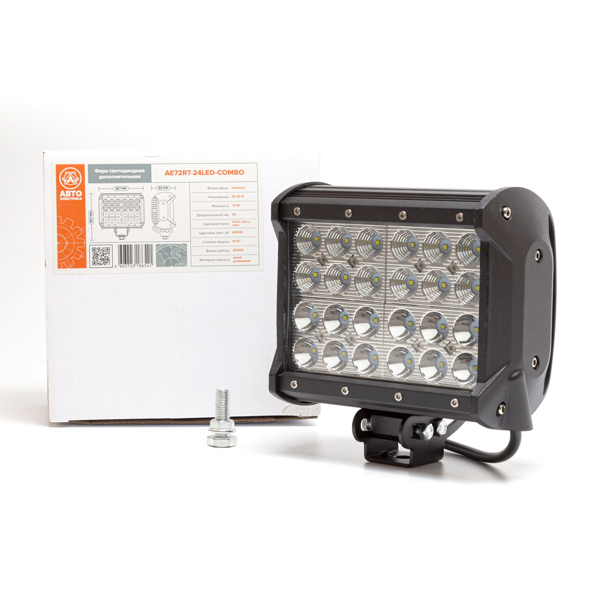 Фара светодиодная дополнительная, прямоугольная 167*93*167, комбинированный свет (направленный/рассеянный), 24 диода, крепление по центру, 72 Вт, 10-30 В